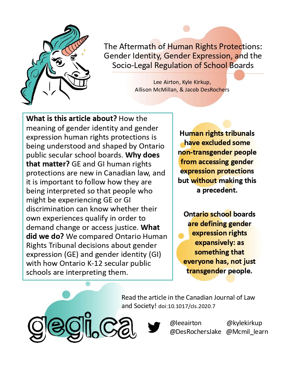 The team behind gegi.ca is researching how Ontario school boards are interpreting gender expression and gender identity human rights protections. If you’d like to learn more about our research, we’ve made some one-page summaries of our articles.